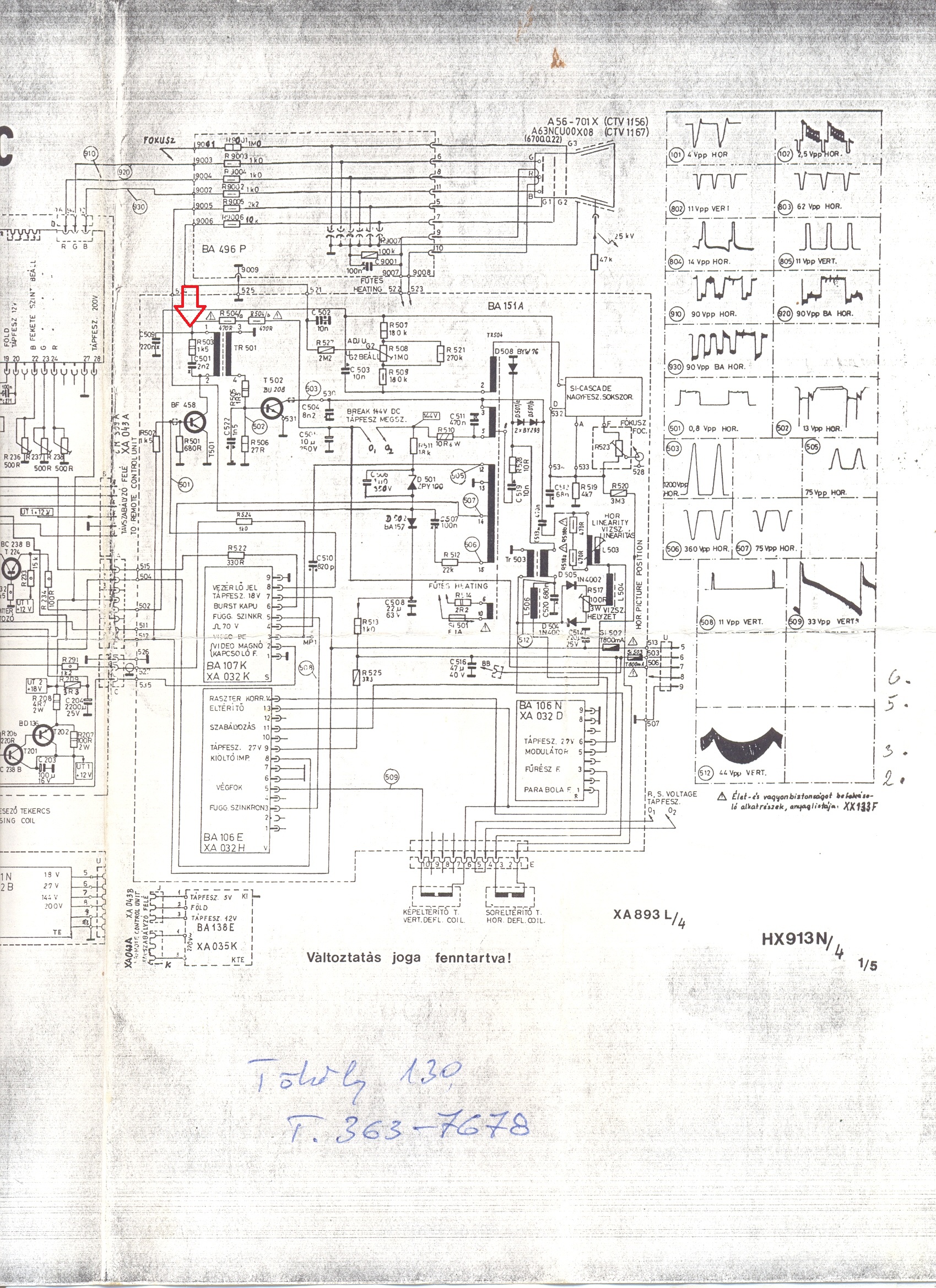 Sikerült elindítani a sorvégfokot, van nagyfeszültség, fény, a TDA1170-et tényleg cserélni kellett. Jelenleg egy homogén zöld képem van, ez is majd még megoldásra vár, viszont amin elakadtam a rajzon piros nyíllal jelölt pont. A tápegység felől stabilak a feszültségek, a táp felől az R504 en megvan a 140V. R504 után a nyíllal jelölt ponton 110V-mérhető bekapcsolás után kb. 10 másodpercig, utána gyorsan csökkenni kezd 77V-ig, majd szép lassan kb. 2 percig megy 30V környékére utána pillanatok alatt lemegy 25V alá, innen nem próbáltam tovább mert az R504 ilyenkor már forró. A tápegység felől eközben a feszültségek továbbra is stabilak, a 140 és a 18V is. BF458 és a BU508A biztosan jó, nagyjából mindent átnéztem a környéken, C504-et cseréltem. Egyenlőre ötletem sincs mi okozhatja ezt. [LINK] [LINK] [LINK]